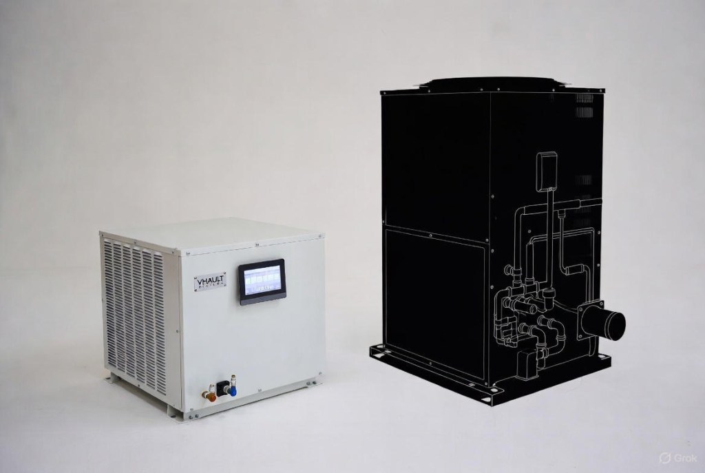 The Vacuum Driven Auto Refrigeration System (VDARS) from Vhault Systems achieves deep and cryogenic cooling through a single vacuum pump and proprietary refrigerant mixture that automatically creates cascading evaporation stages in a closed loop—no compressors, no complex external staging.